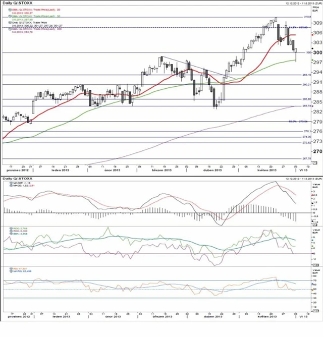Technické indikátory jsou negativní a ženou index na další úrovně podpory. V horizontu pár dní bude důležitá hladina 300 bodů a 50denní klouzavý průměr. Očekáváme, že index během tohoto týdne otestuje 50denní klouzavý průměr (nyní okolo 298 bodů). Ten bude pro další vývoj určující, když pokles pod něj by podporoval scénář dalšího poklesu.