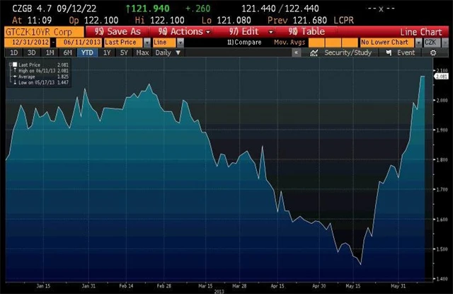 Výnosy rostou téměř všude s výjimkou Portugalska a Slovenska. V Česku vylétl výnos desetiletého dluhopisu za poslední měsíc z 1,3 % na více než 2 %. Jde tedy o více než třetinový nárůst. Proč tomu tak je? Teorie se různí, nicméně většina ekonomů a analytiků přisuzuje výkyvy očekávání zlepšení ekonomického růstu v USA, které by mělo vést k omezení kvantitativního uvolňování Fedu.