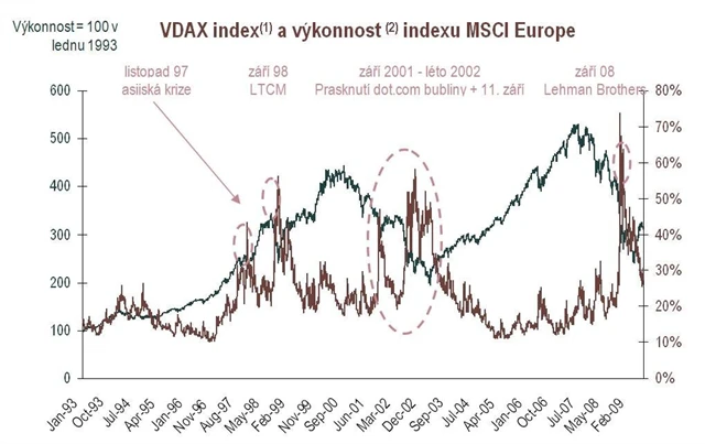 TR: Zjednodušeně řečeno ano. Všimli jsme si, že v obdobích před velkými poklesy trhů roste nervozita na trzích a tu lze měřit právě rostoucí volatilitou. Nejznámější index volatility se jmenu je VIX, měří volatilitu na amerických akciových trzích a přezdívá se mu také index paniky. Obdobný index měří volatilitu na evropských akciových trzích, například pro německý index DAX se jmenuje IVDAX. Odsud už je zbývá jen kousek k fondu, který bere v potaz tržní volatilitu při rozhodování o výši akciové (rizikové) složky.