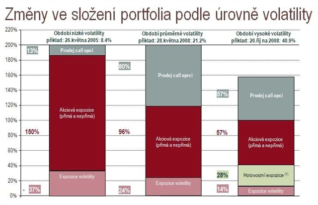 TR: Fond má vlastně pro různé prostředí čtyři různé, jak říkáte "motory", ve standardním ekonomickém prostředí fond pohání aktivní správa zkušeného správcovského týmu. Tato výhoda může být umocněna vyšší, než 100% alokací do akciových titulů. V prostředí nízké volatility fond může volatilitu nakupovat a generovat výnos při nárůstu averze k riziku na trzích a konečně fond systematicky prodává call opce, což generuje výnos na stagnujících nebo klesajících trzích.