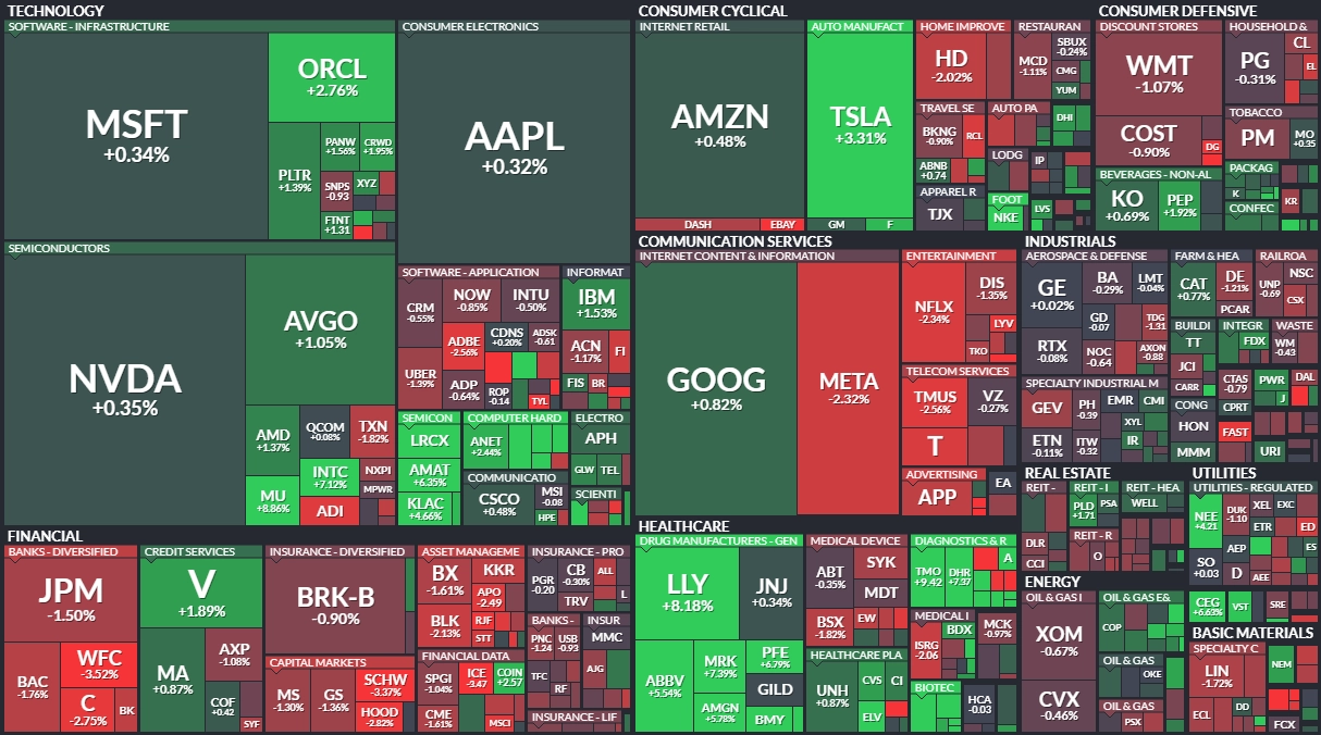 Index Dow stoupl o 0,09 % na nové zavírací maximum 46 441,10 bodu, širší S&P 500 se zvýšil o 0,34 % na nové zavírací maximum 6 711,20 bodu a index technologického trhu Nasdaq Composite uzavřel se ziskem 0,42 % na 22 755,16 bodu. Index S&P 500 navíc navýšil i své rekordní maximum, a to na 6 718,48 bodu. Index volatility VIX stoupl o 0,06 % na 16,29 bodu a výnos 10letých vládních dluhopisů USA se snížil o pět bazických bodů na 4,10 %.