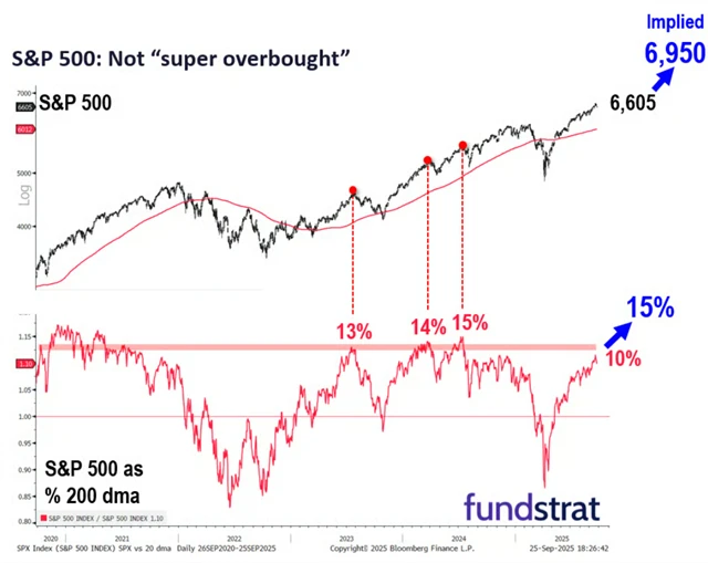 Thomas Lee z Fundstrat Global Advisors, jeden z největších akciových býků na Wall Street, ale neztrácí optimismus. Před pár dny například zveřejnil graf indexu S&P 500, který dává do souvislosti kurz indexu a jeho 200denní průměr. "Současný zhruba 10% odskok indexu nad dlouhodobým průměrem ještě není ani tak velký, aby to signalizovalo lokální vrchol probíhající rally," napsal klientům. Od té doby sice trh stoupl o bezmála dvě procenta, i tak ale Leeho argument zůstává platný. A zmíněný lokální vrchol vyhlíží až okolo 6 950 bodů.