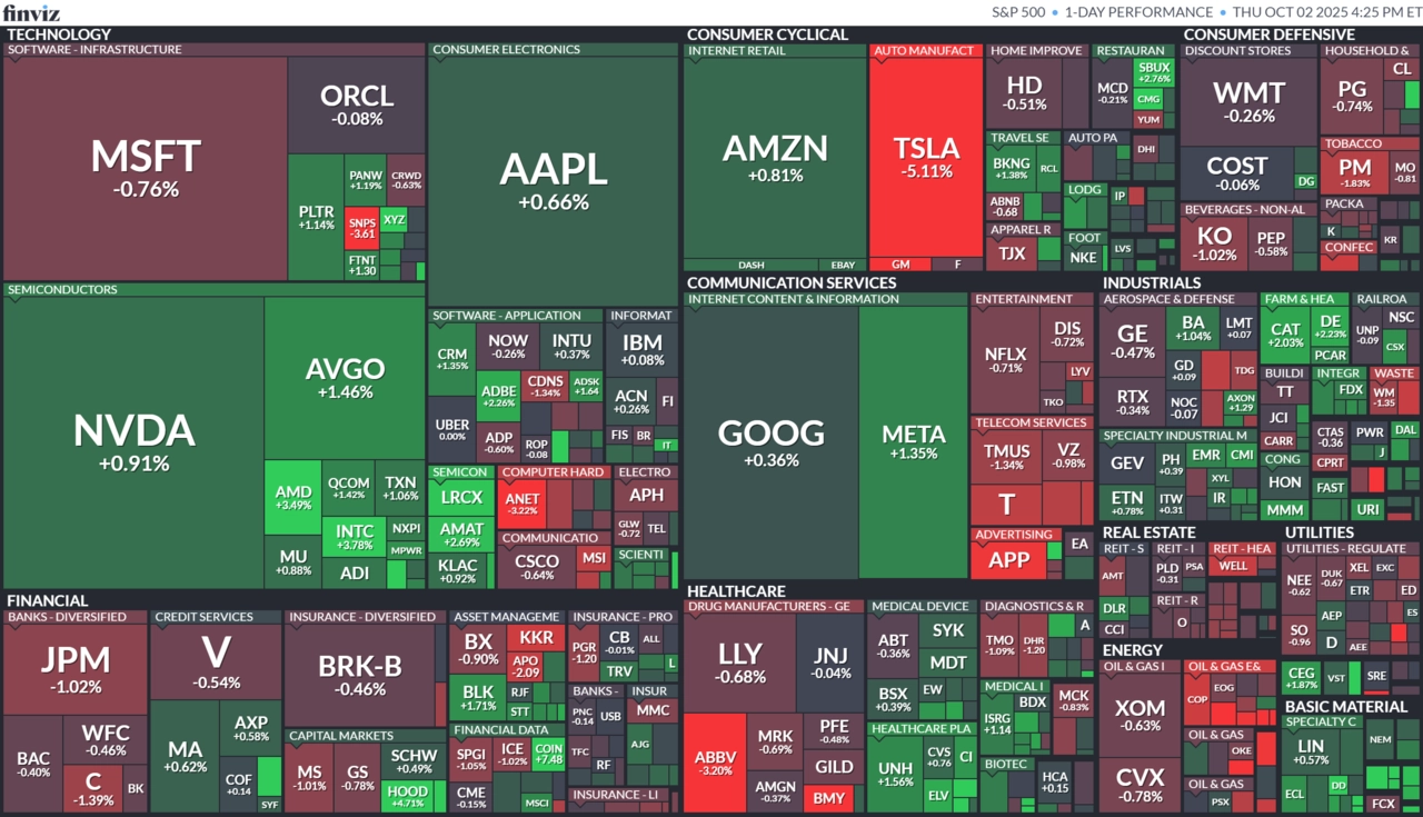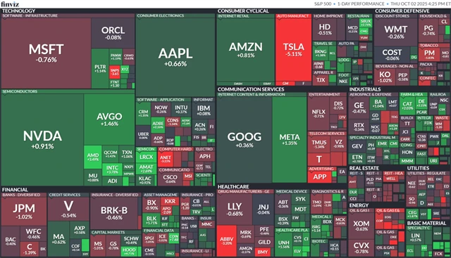 Index Dow přidal 0,17 % na 46 519,72 bodu, širší index S&P 500 vzrostl o 0,06 % na 6 715,35 bodu a technologický Nasdaq Composite se zvedl o 0,39 % na 22 844,05 bodu. Index volatility VIX se posunul o 2,09 % výše na 16,63 bodu a výnos 10letých vládních dluhopisů USA klesl o dva a půl bazického bodu na 4,085 %. Ceny ropy klesly o více než procento a půl, z historického maxima o nepatrných 0,2 % zlevnilo zlato (dolar ale podobnou měrou posílil) a bitcoin zdražil o 2,5 % a obchodoval se zpět nad hladinou 120 tisíc dolarů.