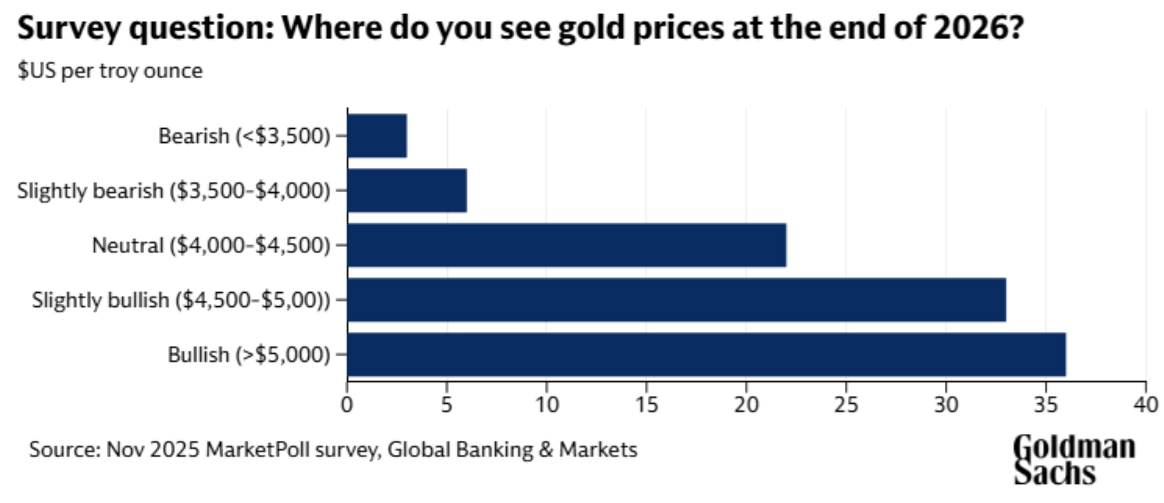 Cena zlata letos vyskočila o skoro 60 % a část institucionálních investorů věří, že růst zdaleka nekončí. Podle průzkumu Goldman Sachs očekává 36 % dotázaných, že se cena do konce roku 2026 dostane nad 5 000 USD za trojskou unci. Více než 70 % oslovených čeká další zdražování kovu v důsledku nákupů ze strany centrálních bank, obavám z fiskálních rizik i vyhlídkám na snížení sazeb Fedu.