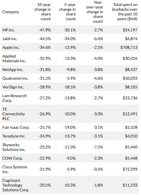 Dalších 14 velkých technologických firem dokázalo během posledních čtyřiceti kvartálů snížit počet svých akcií o více než pětinu. Mezi těmito jmény nechybějí HP, Applied Materials, NetApp, QUALCOMM nebo Cisco Systems.