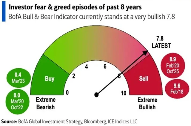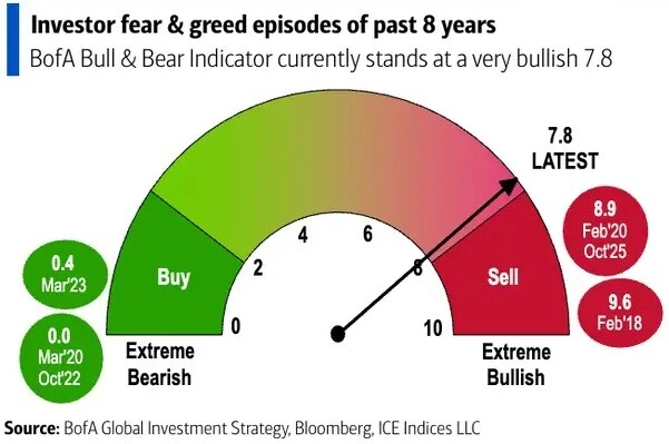 Závěr listopadu a začátek prosince se na amerických burzách nesl v pozitivním duchu, opatrnost u technologických společností s expozicí vůči umělé inteligenci ale přetrvávala. To podle Bank of America může naznačovat, že se investoři snaží ve svých portfoliích eliminovat riziko. "Bull & Bear indikátor blízko varovné úrovně stojí za pozornost, minimálně jako připomínka toho, že ani dlouhodobý růst na trzích nebývá bez přestávek a korekcí," říká Michael Hartnett, hlavní investiční stratég Bank of America Global Research.