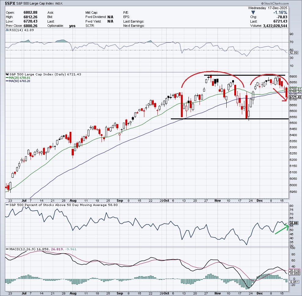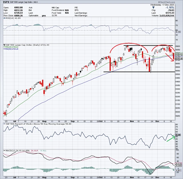 Aktuálně přitom index S&P 500 spadl pod 20- i 50denní klouzavý průměr a na jeho denním grafu se nebezpečně začíná rýsovat silně medvědí formace dvojitého vrcholu. Jak ale ukazuje vývoj podílu titulů nad 50denním průměrem, pokles indexu je způsobený zejména výprodeji v některých konkrétních (a významných) segmentech trhu, zejména jde o firma spojené s umělou inteligencí. Býci se tedy zatím mohou utěšovat tím, že jde o přirozenou rotaci peněz mezi sektory, kdy některé dosud upozaděné části trhu dohánějí náskok velkých technologických společností. Je ale pravda, že by asi vítali rotaci s přece jen o něco menším "rachotem".