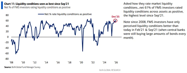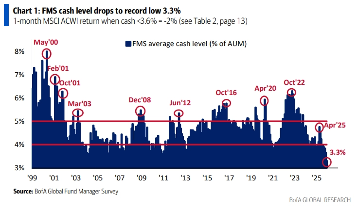 Podíl hotovosti v portfoliích fondů klesl na rekordně nízkou úroveň 3,3 %. To je silný kontrariánský indikátor, že manažeři "nemyslí na zadní vrátka".
