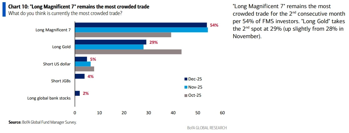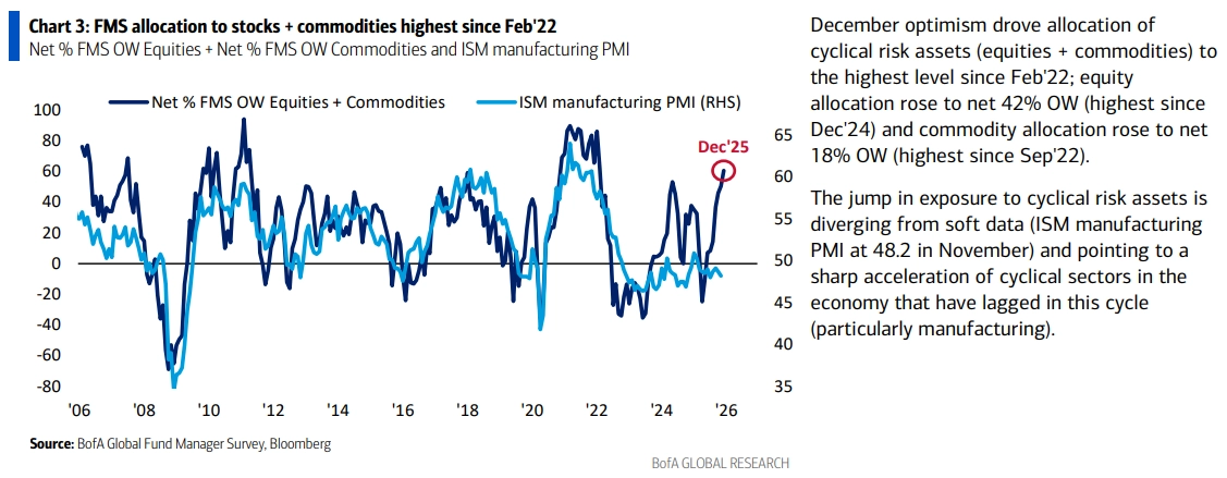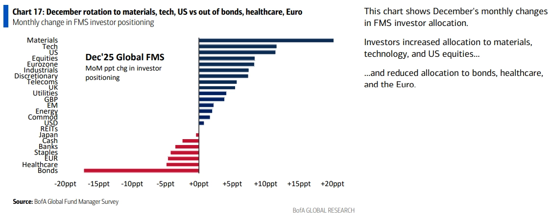 Celkově jsou investoři nejvíce overweight v akciích (maximum od prosince 2024) a komoditách (nejvíce od září 2022), underweight naopak v dluhopisech. Oproti listopadu byl zkraje prosince jasně patrný příklon k většímu riziku.
