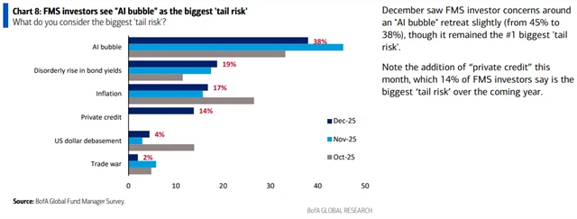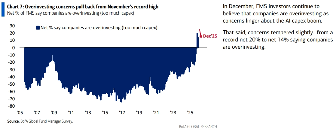 Manažeři také nadále vnímají jako riziko vysoké kapitálové výdaje velkých technologických firem, ale přece jen méně než v listopadu. Obavy v této oblasti se nicméně v posledním týdnu projevují na burze celkem zřetelně.