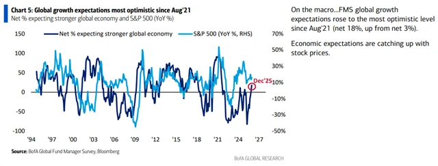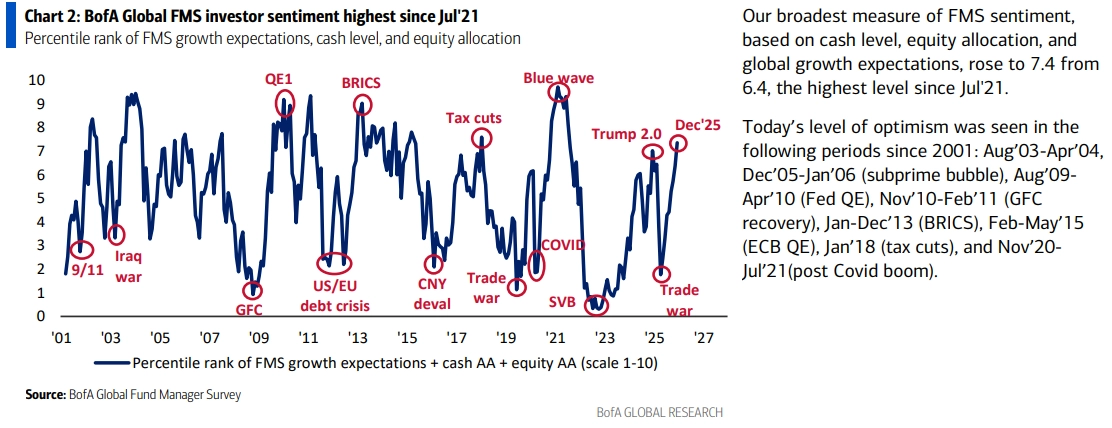 Podle prosincového kola průzkumu Bank of America mezi manažery velkých podílových fondů se nálada investorů dostala na nejoptimističtější úroveň od července 2021.