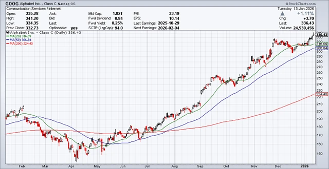 Z hlediska technické analýzy jsou na tom akcie obou firem velice rozdílně. Kurz cenných papírů Alphabetu je nad klouzavými průměry, v případě toho 200denního dokonce nejvýše od roku 2006. Růstový trend je tedy velice silný.