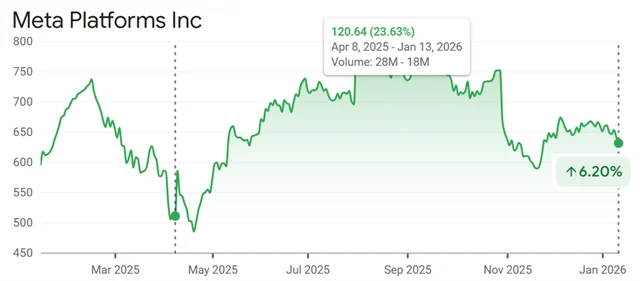 Akcie společnosti Meta Platforms sice také ode dna trhu loni v dubnu posílily (aktuálně drží zisk necelých 24 %), vedle Alphabetu ale firma v současnosti působí jako chudý příbuzný. Investory znepokojují velké kapitálové výdaje na AI infrastrukturu, mají totiž zkušenost s tím, že firma vedena Markem Zuckerbergem umí "pálit hotovost" v neefektivních projektech typu Metaverse a Reality Labs. To stlačuje marže a zvyšuje nejistotu.
