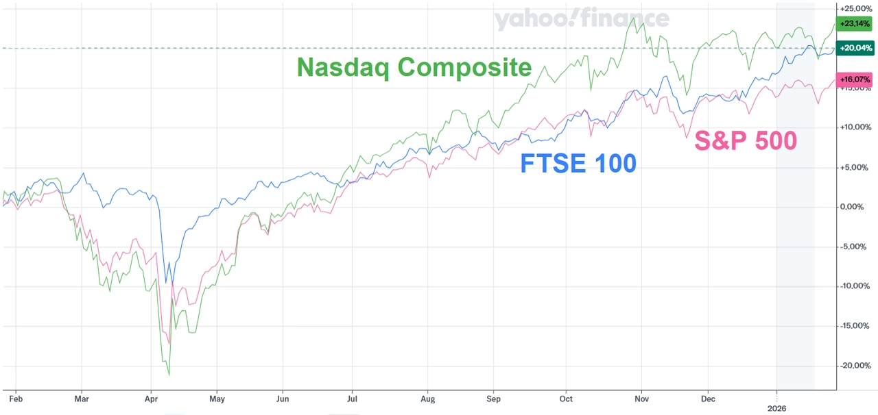 Americký akciový trh byl loni tažený boomem v oblasti umělé inteligence. Index S&P 500 i díky tomu přidal přes 16 %. Spojené království se naproti tomu potýkalo s politickou nestabilitou, slabším ekonomickým růstem a debatami o dalším směřování hospodářské politiky. A přesto britský index FTSE 100 výkonností překonal jak americký široký index S&P 500 (přibližně o pět procentních bodů), tak index technologického trhu Nasdaq Composite (o necelý procentní bod).