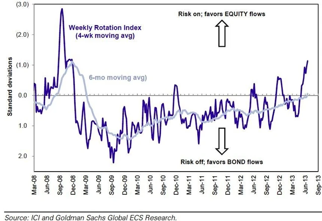 Goldman Sachs (kdo jiný) na téma velké rotace od dluhopisů k akciím vytvořila indikátor, který lépe než co jiného ukazuje, že se investoři z dluhopisových fondů přesouvají do fondů akciových. Ano, graf z poloviny července ukazuje, že si vývoj v posledních týdnech doslova říká o korekci, trend je ale stále nahoru, tedy v prospěch akcií na úkor bondů.