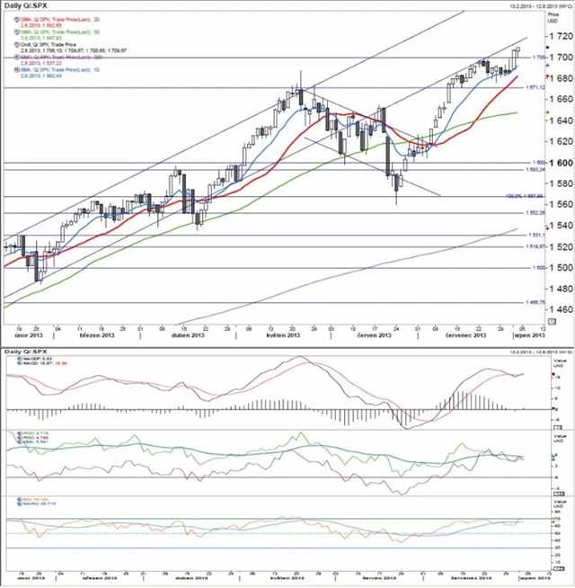 Indexu se podařilo dostat přes psychologickou hranici 1 700 bodů. Hlavní klouzavé průměry rostou v býčí formaci. MACD se po chvilkovém zaváhání vrátilo nad spouštěcí linii. Obě ROC se vyvíjejí do strany. ROC60 těsně pod 20denním klouzavým průměrem. RSI už vzrostlo na hranici překoupenosti.