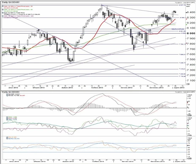 8 538 historický rekord z května 2013, 8 350 klesající trendová linie, 8 272 20denní (exponenciální) klouzavý průměr, 8 166 50denní (exponenciální) klouzavý průměr, 8 165 rostoucí dlouhodobá trendová linie, 8 000 psychologická úroveň, 7 813 200denní (exponenciální) klouzavý průměr.