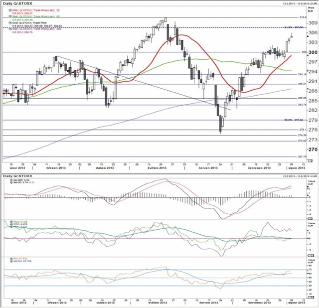 Technické indikátory jsou celkově spíše pozitivní, a hovoří tak pro pokračování růstu. Na druhou stranu, prostor pro růst na současné úrovni omezuje květnové lokální maximum okolo 311 bodů. Očekáváme, že index se v průběhu tohoto týdne opět o něco přiblíží květnovému lokálnímu maximu okolo 311 bodů.