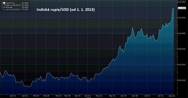 Podle Richarda Yetsengy z australské banky ANZ jsou problémy Indie takovým mikrokosmem, který ilustruje to, co se teď děje na všech emerging markets. Indická rupie se prudce propadá a každým dnem prohlubuje minima v páru s americkým dolarem. Od začátku roku ztratila 15 %.