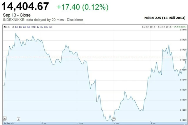 Japonský Nikkei posílil o 0,12 %, za celý týden tak zpevnil bezmála o 4 %. Širší Topix od začátku měsíce do včerejška připsal přes sedm procent díky zprávě, že Tokio bude hostit Olympijské hry v roce 2020. Jeho zisk od začátku roku tak činí 38 %, což z něj podle údajů agentury Bloomberg dělá nejúspěšnější index na rozvinutých trzích.