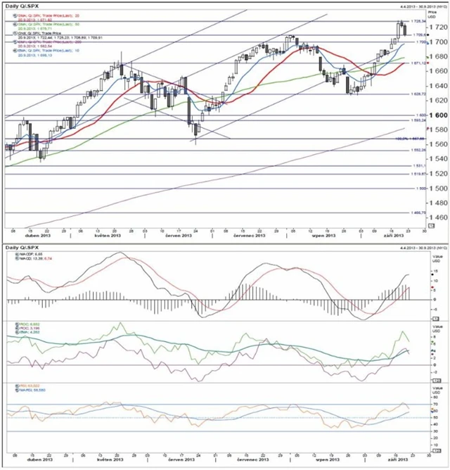 Index se v reakci na rozhodnutí Fedu (pokračovat v QE v plném tempu) dostal až na historické maximum. Poté se ale vrátil k lokálnímu maximu z konce července. MACD stagnuje a je pozitivní. Obě ROC mírně klesají a ustupují z maxim. RSI sestoupilo z pásma překoupenosti.