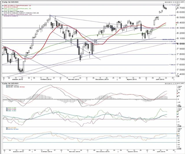 8 739 historický rekord ze září 2013, 8 396 20denní (exponenciální) klouzavý průměr, 8 361 50denní (exponenciální) klouzavý průměr, 8 270 klesající dlouhodobá trendová linie, 8 009 200denní (exponenciální) klouzavý průměr, 8 000 psychologická úroveň.