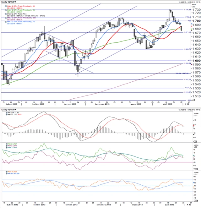 Celkově jsou technické indikátory negativní. Situaci zhoršuje i aktuální testování 50denního klouzavého průměru (zelená linie). Z krátkodobého pohledu bude důležité, zda index klesne pod 20- a 50denní klouzavý průměr. Pokud ano, otevřela by se mu cesta až do pásma 1 630 až 1 650 bodů.