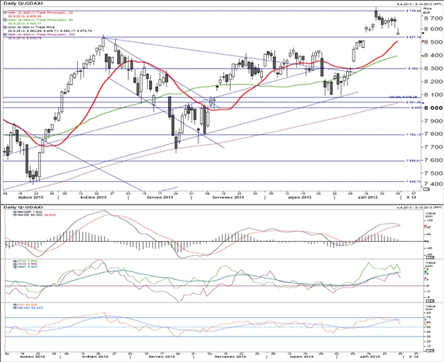 8 739 historický rekord ze září 2013, 8 509 20denní (exponenciální) klouzavý průměr, 8 396 50denní (exponenciální) klouzavý průměr, 8 270 klesající dlouhodobá trendová linie, 8 036 200denní (exponenciální) klouzavý průměr, 8 000 psychologická úroveň.