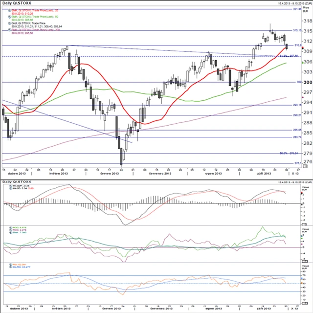 Technické indikátory jsou celkově mírně negativní. Očekáváme, že mírně negativní tendence bude přetrvávat. Pro další vývoj pak budou určující úrovně podpory v pásmu 308 až 310 bodů.