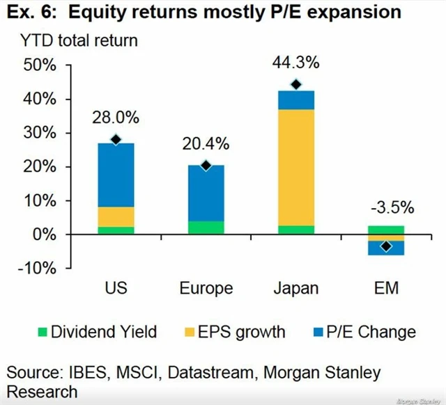 Morgan Stanley ukazuje, z jakého důvodu rostly akcie na jednotlivých trzích.