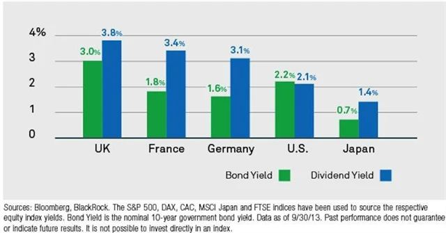 Investiční společnost BlackRock sestavila přehledný graf výnosů ke konci třetího kvartálu. V té době s výjimkou USA akcie na vyspělých trzích dividendovými výnosy překonávaly výnosy 10letých vládních bondů. Ti od té doby mírně vzrostly, ceny akcií také (například v USA nebo v Německu), což dividendové investory mohlo zneklidnit. Při sázce na akcie ale ve stejné době mohli těžit z růstu cen samotných akcií.