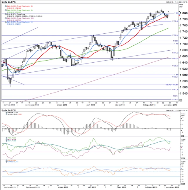 1 800 psychologická úroveň, 1 792 20denní (exponenciální) klouzavý průměr, 1 773 lokální vrchol, 1 763 rostoucí (horní) trendová linie, 1 752 50denní (exponenciální) klouzavý průměr.