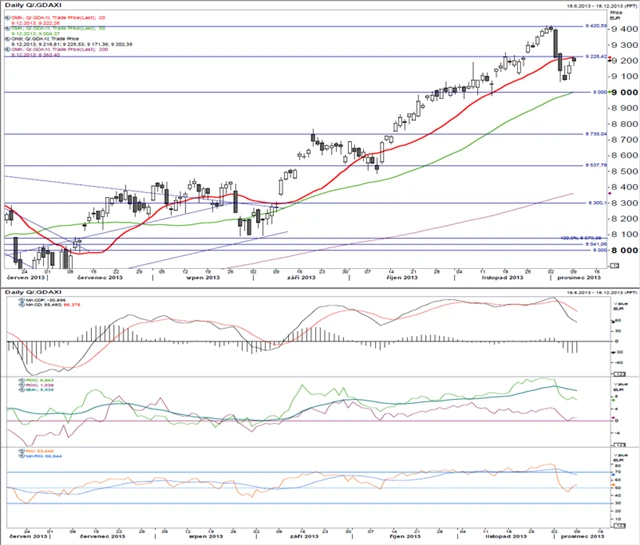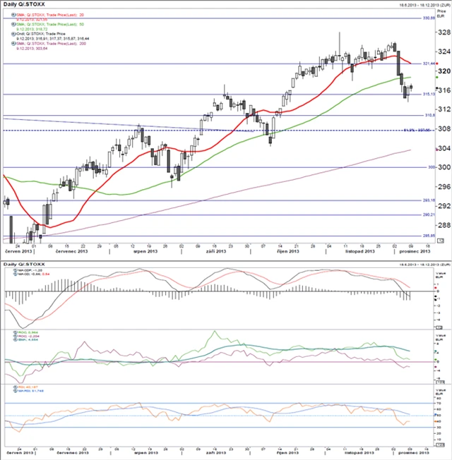 Technické indikátory jsou celkově lehce negativní a spíše budou tlačit index v následujících dnech níže. Index se nejdříve může pokusit o korekci poklesu k 50dennímu klouzavému průměru (zelená linie), ale poté pravděpodobně spíše převládne tendence k vybírání zisků.