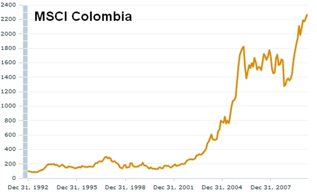 Z rozvíjejících se trhů zaznamenal za uplynulých deset let nejvyšší zhodnocení kolumbijský akciový trh s téměř 30 % p. a. následovaný trhem peruánským (21 % p. a.), indonéským (18 % p. a.) a brazilským (17 % p. a.).