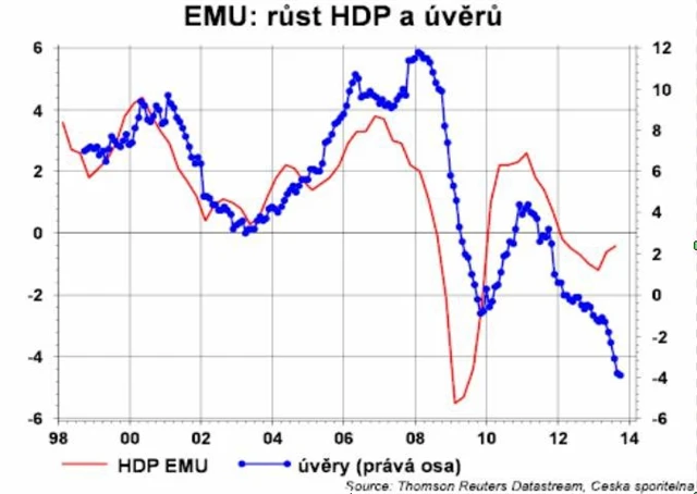 Důvěra spotřebitelů a podniků se v eurozóně zvyšuje. Oživení se ale zadrhne na bankovním sektoru. Firmy jsou v Evropě výrazně závislé na úvěrech, šestkrát více než v USA. A úvěry v eurozóně klesají. Navíc budou banky muset zvyšovat kapitálovou přiměřenost. K tomu přidejme testování bank v eurozóně, které bude probíhat do října 2014.
