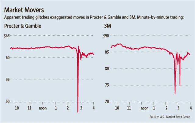 Zvláštní skupinou jsou tzv. rychloobrátkové obchody, kde během vteřiny probíhají stovky až tisíce obchodů na základě nastavených algoritmů. Tento systém pracuje bezlidských emocí a soustředí se pouze na ten "správný" algoritmus a nadosažení likvidity. Stačil tedy například jeden pokyn k tomu (média hovoří o "překlepnutí" jistého obchodníka v zadávání pokynu – to dle mého názoru nebyla hlavní příčina), aby se spustila výprodejová vlna, která v určitém okamžiku vedla k dočasnému "zmizení" poptávky. A tak jsme mohli vidět zajímavé pohyby na velmi bonitních akciích, jako jsou Procter & Gamble či 3M – viz obrázky níže. Největší paradox byl asi u akcií Accenture, kde v jednu chvíli akcie klesly z 40USD na 0,01 USD!