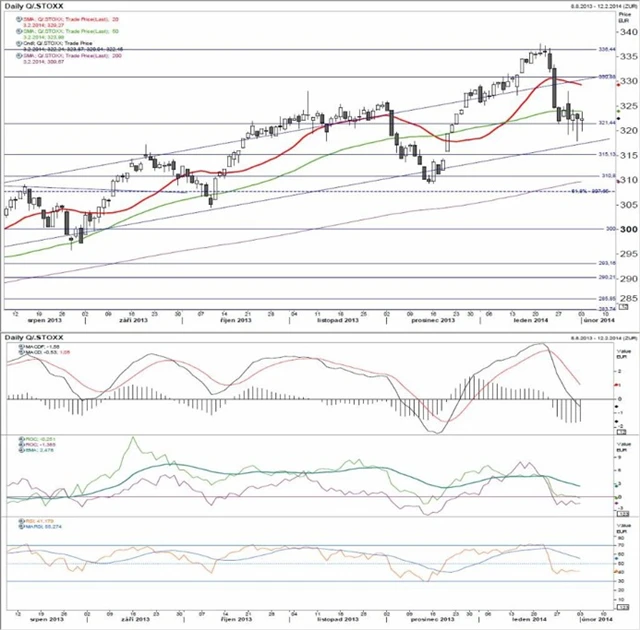 Technické indikátory jsou celkově negativní a budou pravděpodobně tlačit index ke spodní hraně trendového kanálu. Očekáváme, že index bude v průběhu týdne dále ztrácet. Signálem slábnoucího negativního tlaku by byl případný nárůst nad 50denní klouzavý průměr (zelená křivka).