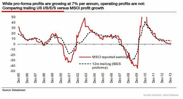 Upozorňuje na to, že růst zisků je v posledních měsících slabý, především na mladých se trzích. Většina vykazovaných zisků je totiž upravená o mimořádné vlivy, což je hlavní motor jejich růstu. "Dokonce ani tato upravená čísla nevypadají dobře," říká. Ukazuje to následující graf (přerušovaná čára zobrazuje růst upravených zisků, červená čára vykazovaný růst zisků).