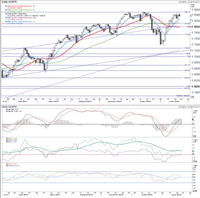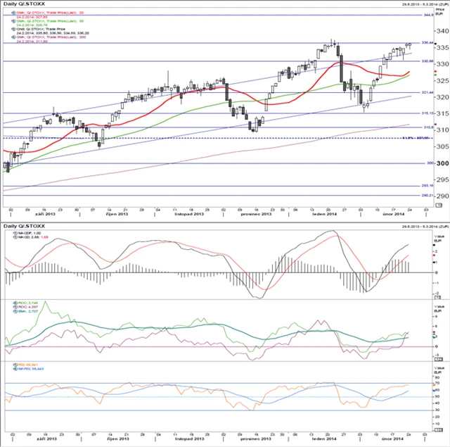 Index se dostal až těsně pod letošní maximum. 20denní klouzavý průměr otočil těsně nad 50denním a začal růst. MACD pokračovalo v růstu a drží se nad signální linií. ROC20 se po překonání nulové úrovně skokově zvýšilo, ROC60 pokračovalo do strany. RSI pozvolna roste směrem k hranici pásma překoupenosti.