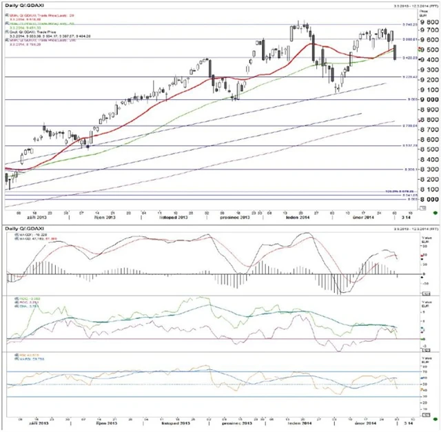 Index se nejdříve dostal na nové lokální maximum, ale poté ostře korigoval. MACD se výrazně přiblížilo signální linii shora. Při jejím protnutí hrozí prodejní signál. Obě ROC se vyvíjely do strany. RSI spadl až k 50bodové hranici.