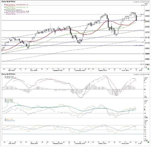 Na technických indikátorech je vidět poslední ostré negativní momentum. Pro další vývoj bude důležité, zda se index udrží nad 50denním klouzavým průměrem (zelená křivka). Při poklesu pod něj se může dostat až ke spodní hraně trendového kanálu (aktuálně kolem 322 bodů).