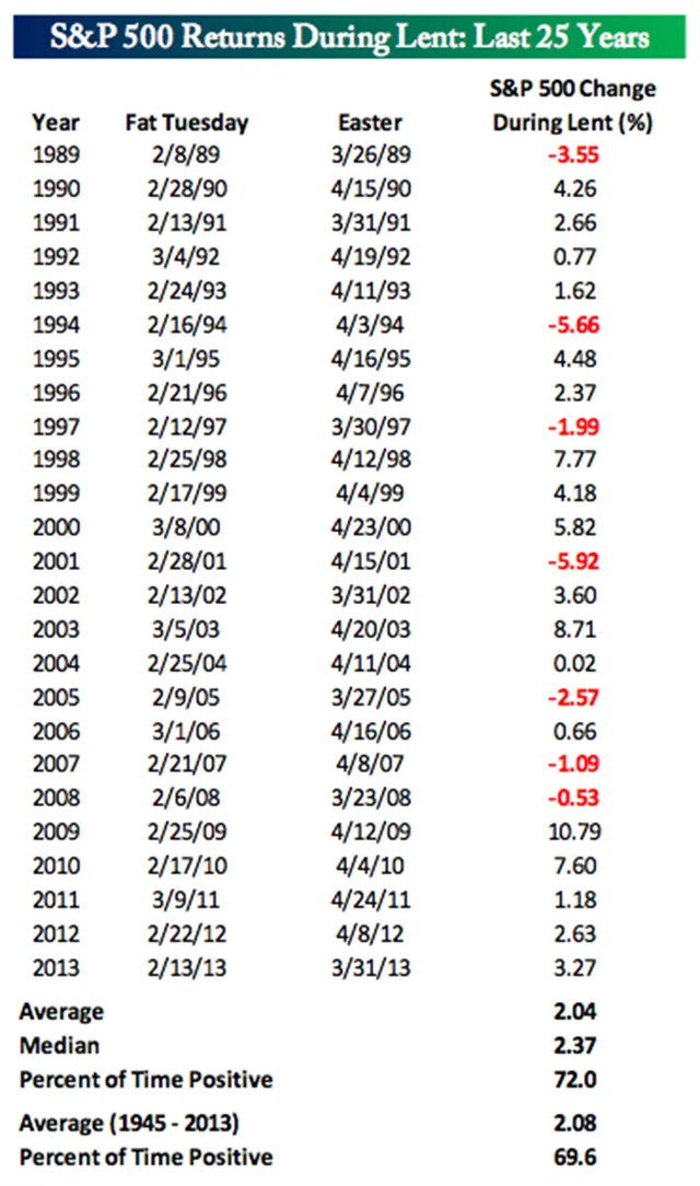 Jedním z projevů obětování se během postního období by pro křesťany mohlo být i zbavování se dlouhých pozic. Bespoke Investment Group otestovala strategii nákupu na Popeleční středu a prodeje na Velikonoce sledováním celé čtyřicetidenní periody během uplynulých desetiletí. V průměru S&P 500 v průběhu tohoto období v minulých letech zpevnil o více než dvě procenta. Od roku 1945 se akciím dařilo v téměř 70 % let, za posledních 25 let byla úspěšnost ještě mírně vyšší.