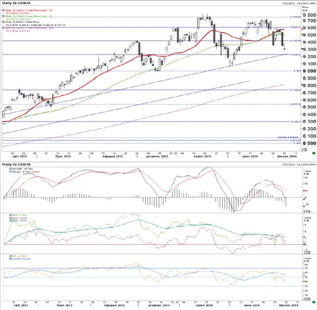 Technické indikátory jsou celkově negativní. Očekáváme, že index v tomto týdnu nejdříve otestuje rostoucí trendovou linii okolo 9 230 bodů. Při jejím prolomení hrozí pád až na 9 000 bodů.