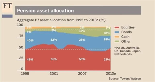 Institucionální investoři mají podle něj v současnosti aktiva o objemu 75 bilionů dolarů. Penzijní fondy z toho drží kolem 32 bilionů. Jsou to tedy nejdůležitější hráči na trhu. Zatímco do akcií i přes prudký růst cen investují poměrně stabilně, podíl dluhopisů klesá.