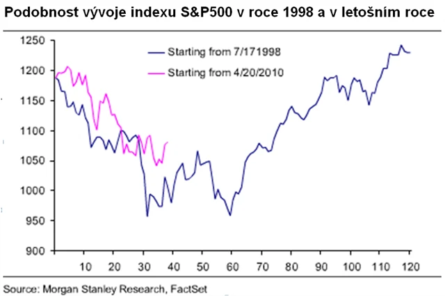 Podobně jako v roce 1998 investory nejvíce znepokojovala rizika nesplácení státních dluhů a finanční krize. Tyto obavy se v minulosti promítly (pozn. během 3 měsíců) do 20procentní korekce na americkém akciovém indexu S&P 500, následně však trh vyrostl stejně rychle nahoru.
