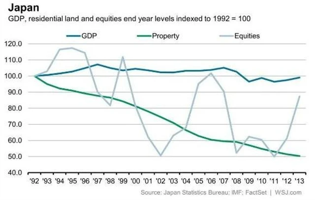 V Japonsku se v posledních dvou dekádách nedařilo ani jednomu z těchto aktiv. Akcie v zemi vycházejícího slunce zaostaly dokonce i za výkonností tamní ekonomiky, která měla co dělat, aby vůbec uhájila svoji "startovní" pozici, a ceny nemovitostí spadly na polovinu.