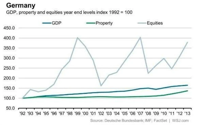 Naproti tomu v Německu zažili investoři v posledních 22 letech nefalšované akciové žně. Německé cenné papíry zdražily takřka na čtyřnásobek, takže nemovitosti, jejichž ceny ve stejném horizontu vzrostly "pouze" o necelou polovinu, nechaly s přehledem za sebou.