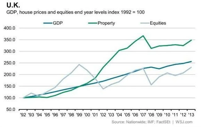 Vůbec nejlepší destinací bylo v posledních více než dvou desetiletích z pohledu realitního trhu Spojené království. Britové, kteří si na začátku 90. let koupili dům či byt, by nyní při jeho prodeji zinkasovali 3,5násobek investované částky. Špatně nicméně nedopadly ani britské akcie, jejichž cena se od roku 1992 více než zdvojnásobila.