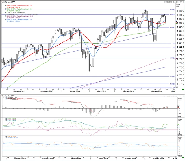 1 893 vrchol, 1 862 20denní klouzavý průměr, 1 858 50denní klouzavý průměr, 1 800 psychologická úroveň, 1 798 rostoucí (horní) trendová linie, 1 772 200denní klouzavý průměr.
