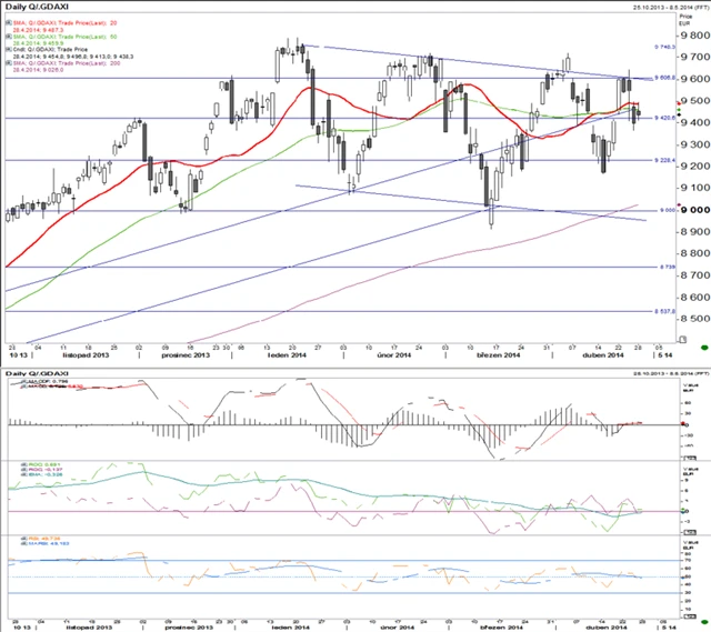 Technické indikátory odrážejí aktuální váhavou situaci. Pokud se index rychle nedostane nad 20denní klouzavý průměr (červená linie), hrozí pokles až k předchozímu lokálnímu minimu okolo 9 200 bodů.